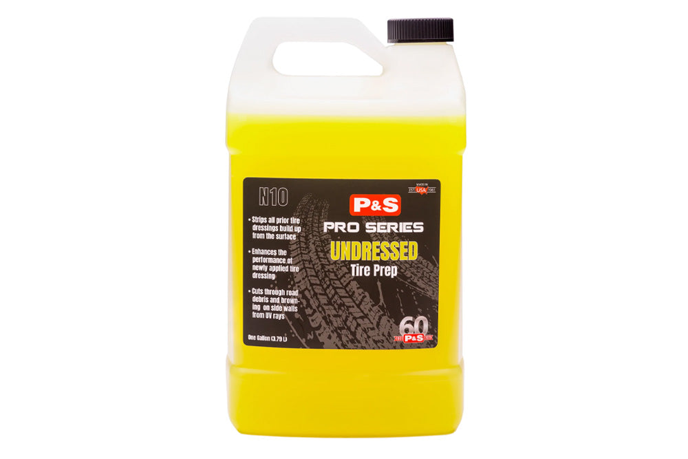 P&S Undressed is an auto tire cleaner that penetrates and removes layers of road dirt, oil, and grime from the tire's surface. It is designed to brighten raised white lettering and whitewalls and is known as one of the most effective tire cleaners on the market. The alkaline cleaning solutions, water-based solvents, and detergents in Undressed make it the best choice for preparing tires for dressing. Simply apply the product to the tires, allow it to penetrate and remove dirt and grime, and then rinse it off to reveal a clean, bright surface. Whether you are preparing your tires for dressing or simply want to keep them clean, P&S Undressed Tire Prep is an excellent choice.