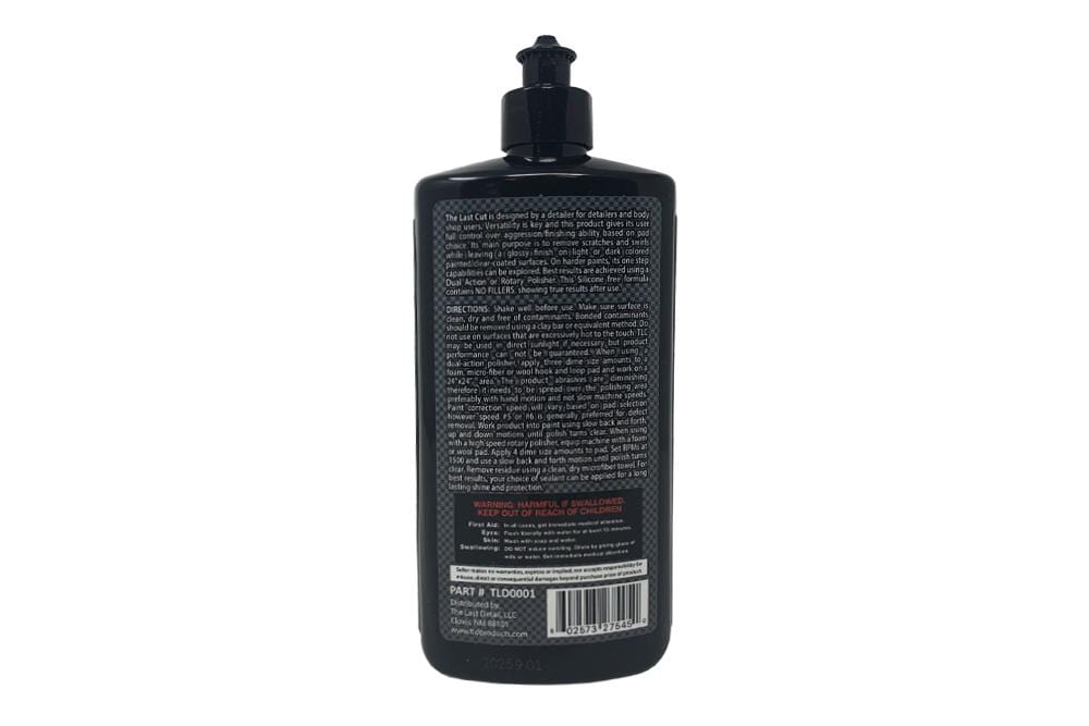 The Last Cut Compounding Glaze is designed by a detailer for detailers and body shop users. Versatility is key and this product gives its user full control over aggression/finishing ability based on pad choice. Its main purpose is to remove scratches and swirls while leaving a glossy finish on light or dark colored painted/clear-coated surfaces. On harder paints, its one step capabilities can be explored. Best results are achieved using Dual Action and Rotary Polisher. This Silicone free formula contains NO FILLERS; showing true results after use.